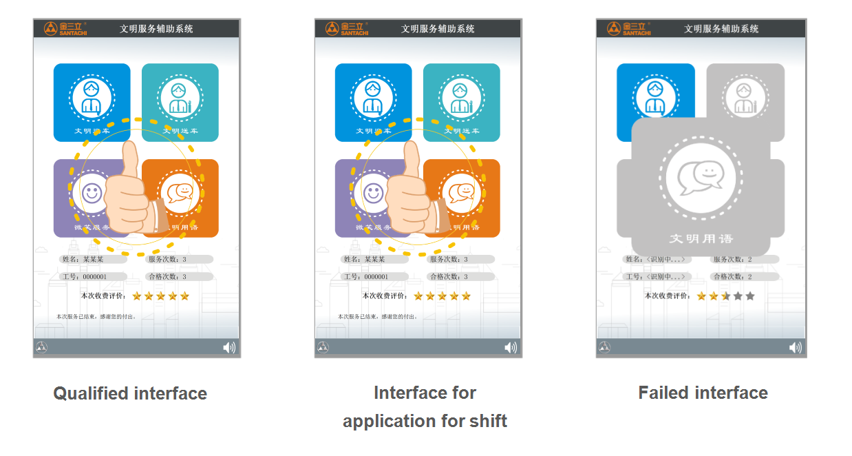 The civilized service display terminal can initiate a shift change application, evaluate the results and suggestions for improvement in real time with a graphical interface and voice prompts.
