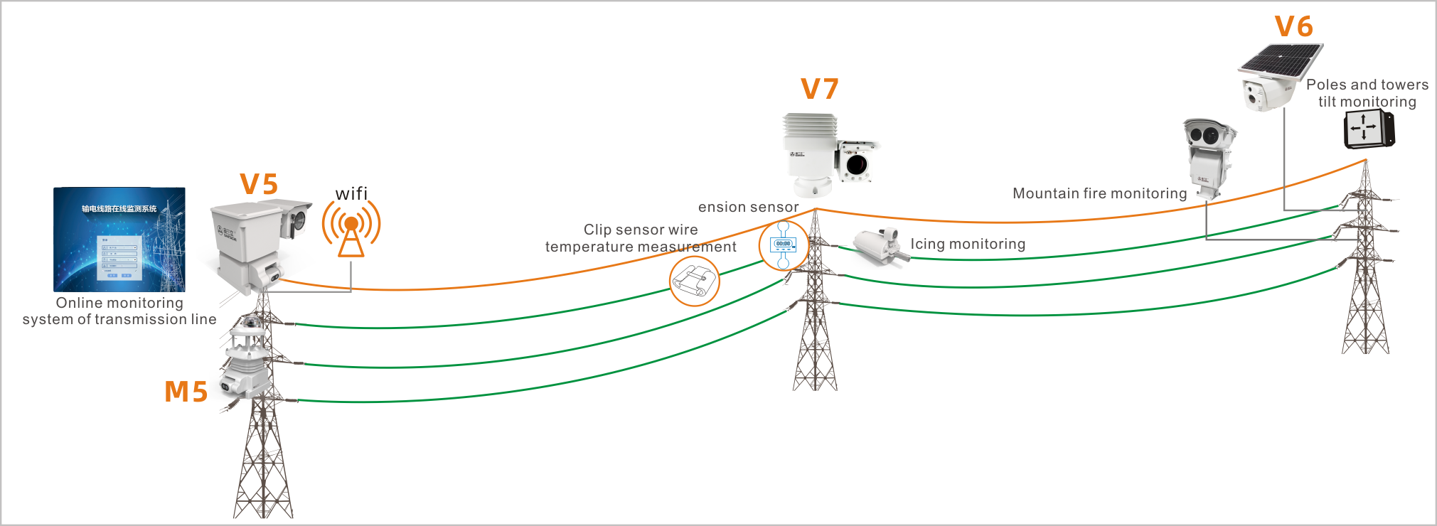 For overhead transmission lines, Santachi's intelligent online monitoring devices V5 (Intelligent Dynamic Capture Camera for Online Transmission Monitoring), V6 (Intelligent Image Binocular Integrated Machine for Online Transmission Monitoring), and V7 (Intelligent Video Device for Online Transmission Monitoring) series products analyze the status of the transmission line equipment and the surrounding environment, uploads the data to the system platform in real time, and promptly alerts by acquiring the video /image , integrating the front-end AI intelligent analysis, automatic inspection and hidden danger analysis and other functions . At the same time, the monitoring device integrates sensors such as poles and towers tilt and micro-meteorology to realize multi-dimensional monitoring of transmission lines, which can effectively prevent the malicious event resulted from external forces such as construction machinery, wire and other foreign objects, bird hazard, mountain fires, and traffic incidents from occurring, and ensure the safe and stable operation of overhead transmission lines .