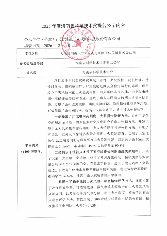 金三立关于参与“天地协同山火立体监测与风险评估关键技术及应用”项目提名“2025年度海南省科学技术奖”信息公示