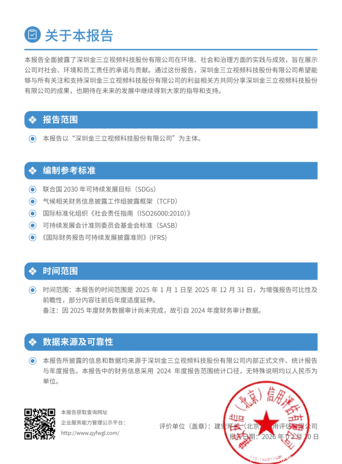2026年03月05日,深圳 金三立 视频科技股份有限公司在第三方机构协助下完成ESG报告编写与出具工作,从环境责任、公司治理、社会责任等多方面充分体现了企业的可持续发展能力,现将相关报告发布如下:https://v2.fangcloud.com/share/67c1fcf5b3bc6323954274ded1