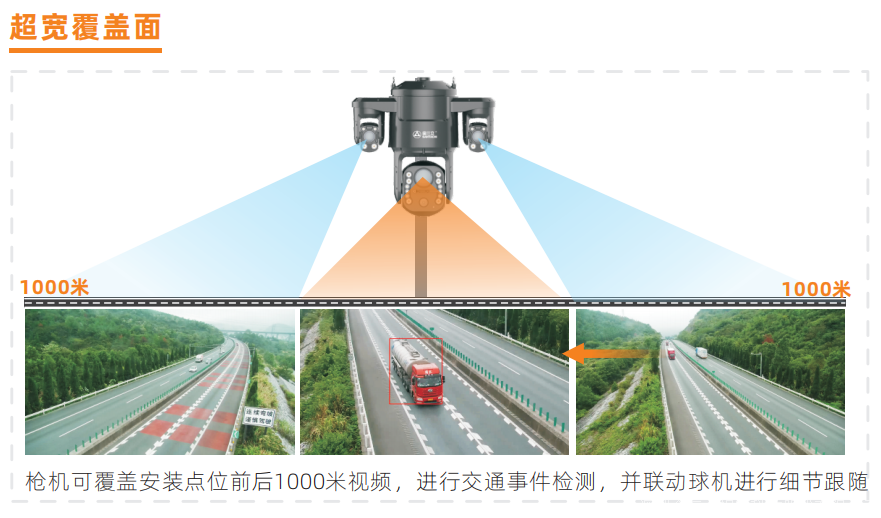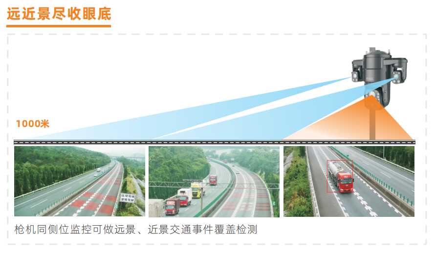 全程卫士Q9,采用双枪一球一体化、七轴旋转设计,结合交通事件监测技术和视频跟踪技术,实现全视角、智能化全程监控。