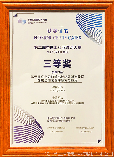 中国工业互联网大赛是由工业和信息化部、浙江省人民政府联合主办,南部(深圳)赛区由深圳市龙华区人民政府联合承办,旨在充分利用社会资源, 优化并提供创业辅导、金融支持、人才对接、孵化培育等常态化服务,为工业互联网发展营造更好的生态环境 。10 月 15 日,在深圳市公证处严格监督下, 南部赛区 497 支队伍中, 不乏华为、广东电科院、深圳北斗等优秀企业参赛,最终 8 支队伍获胜,金三立(简称)和中国科学院自动化研究所(简称)联合参赛项目“基于深度学习的输电线路智慧物联网在线监测装置的研究与应用”荣获“三等奖”。
