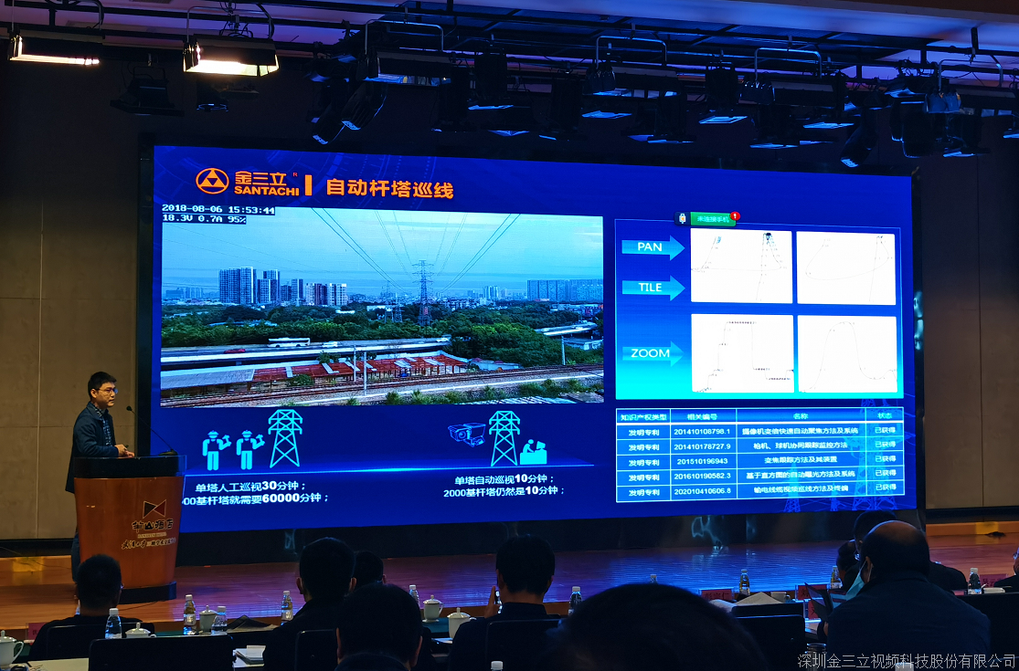 在支持单位技术成果推介环节,金三立副总经理张宇作题为《全天候智能巡检》的技术汇报,他介绍了公司独创的产品和技术,将深度学习算法、新材料、热成像、微气像、拉力/ 倾角监测等技术与视频处理技术深度融合,攻克了输电运维的技术难点,产品应用于覆冰、引流板测温、山火等特殊输电场景,真正助力用户实现全天候智能化巡检,提升了输电运维效率。