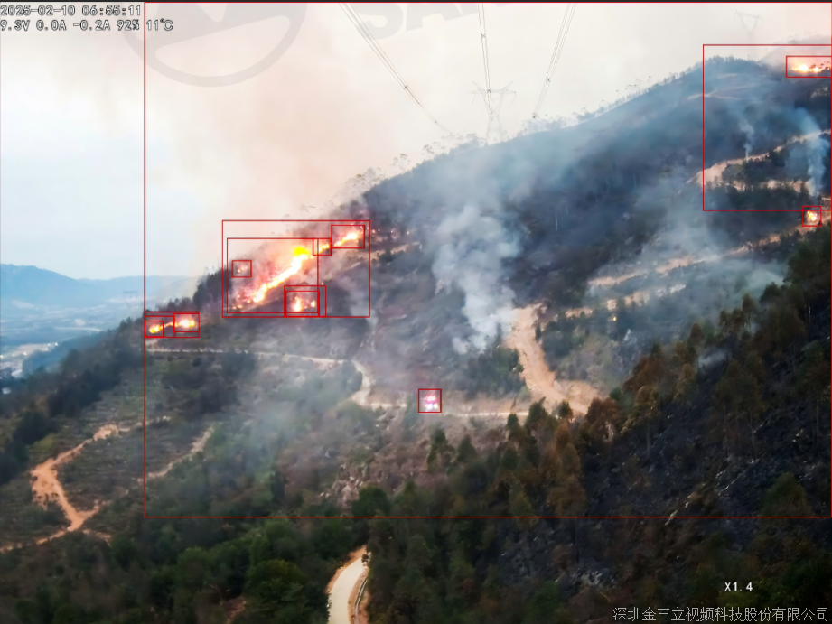 采用人工智能视觉识别, 自动识别烟雾、火光等火情特征,结合测距功能精准测量烟火与导线间距离,实现快速预警响应。 解决了传统山火监测手段在复杂地形与林密区域,对输电线路风险评估能力不足的问题。