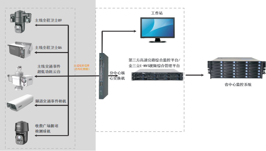 金三立前端交通事件检测系统主要由前端视频采集及智能分析部分及高速公路监控综合平台两个部分组成,其中由前端视频采集及智能分析部分主要作用为视频监控和前端交通事件检测分析功能,前端摄像机内置 AI 芯片,摄像机实时分析视频中各项交通事件及交通状态,并将得到的分析结果上传给高速公路监控综合平台,用户可以通过监控电脑登入高速公路监控综合平台进行交通事件的查询、管理和保存等各项工作;此外高速公路监控综合平台还能联动电视墙,将发生交通事件的监控点位快速联动到电视墙重点显示。